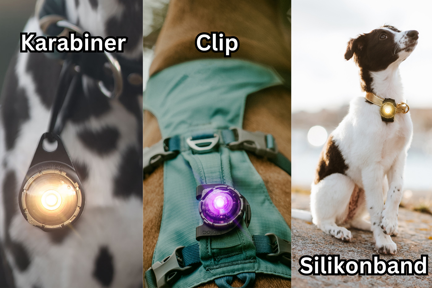 Karabiner – ideal bei dichtem Fell, damit das Licht nicht verdeckt wird